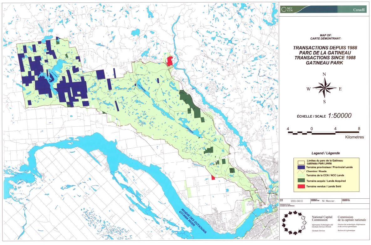 La CCN prétend que les terrains hachurés en bleu sur cette carte appartiennent au gouvernement du Québec, bien qu’ils aient été transférés au gouvernement fédéral en 1973. Par ailleurs, la CCN verse les paiements tenant lieu d’impôts fonciers pour ces 12 500 acres de terrains dans le parc.